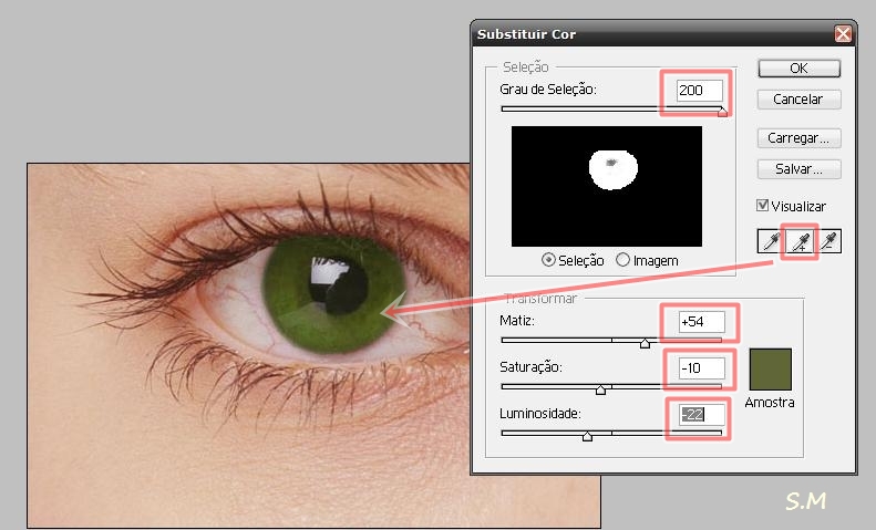 5. Denomine os valores (grau de seleção= 200, Matiz= +54, Saturação= -10, Luminosidade= -22), depois passe o conta gotas em toda a parte a ser modificada.